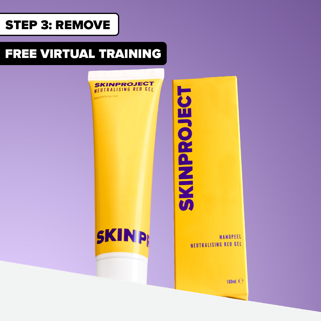 - Apply a thin layer of SKINPROJECT NANOPEEL EYE to the undereye area. Leave for a maximum of 3 minutes and use the SKINPROJECT NEUTRALISING RED GEL to remove the product.